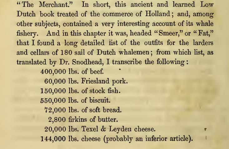 Ook de walvisvaarders namen ‘Leyden cheese’ mee. In het beroemde verhaal van de Moby Dick noteert schrijver Herman Melville een voorraadlijst van een Hollandse walvisschip uit het begin van de 19e eeuw. Hij steekt de draak met de gigantische hoeveelheden kaas en boter die de Hollanders meenamen. Maar belangrijker voor ons verhaal: hij noemt nadrukkelijk de ‘Texel & Leyden cheese’. De ‘cheese’ zonder naam is ‘waarschijnlijk van mindere kwaliteit’.